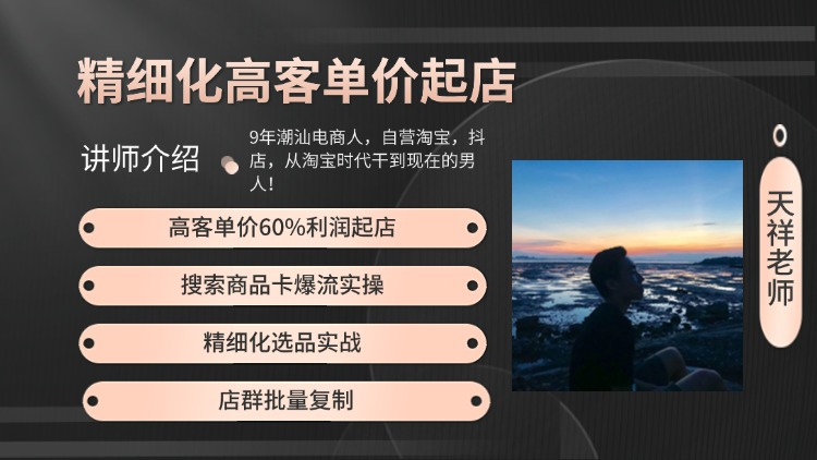 精细化高客单价起店 1.高客单价60%利润起店 2.搜索商品卡爆流实操 3.精细化选品实战 4.店群批量复制